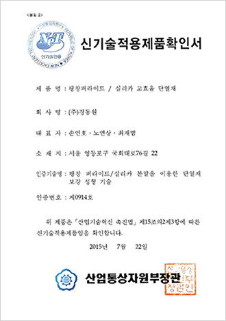 초고효율 마이크로포러스 보온재 ‘ULTRATHERM’(울트라썸)과 고성능 흄드실리카계 진공단열재 ‘HYPER-VAC’(하이퍼-백)이 산업통상자원부로부터 신기술(NET) 적용 제품 확인을 받았습니다. 지난 4월, 신기술(NET) 인증을 받은 데 이어 두 제품이 신기술(NET)이 적용된 제품이라는 것을 확인 받은 것입니다.. 초고효율 마이크로포러스 보온재 ‘ULTRATHERM’은 꿈의 보온재로 알려진 에어로젤 단열재와 비교해서 약 225%의 단열 성능을 자랑하며, 진공단열재 HYPER-VAC 역시 기존 건축용 단열재인 스티로폼과 비교하여 약 9배 이상의 단열 성능을 갖고 있습니다. 산업통상자원부로부터 확인을 받음으로써 경동원은 신제품들의 상용화에 더욱 박차를 가할 수 있게 되었습니다. |